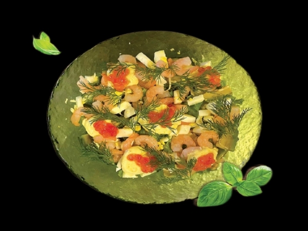 Листья салата, авокадо, коктейльные креветки, яйцо, огурец, красная икра