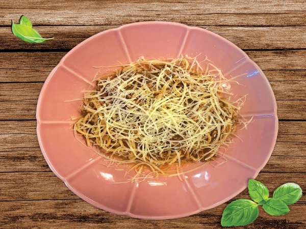 Спагетти со свино-говяжьим фаршем, фирменным томатным соусом со специями и сыром Пармезан