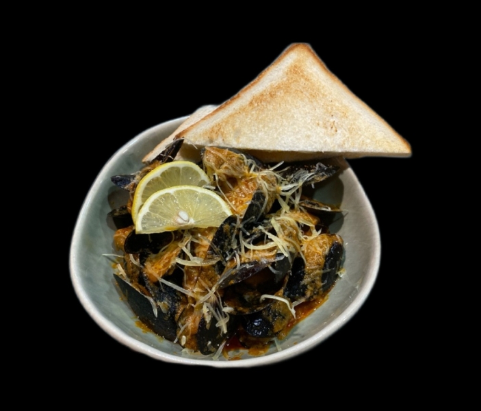 Черноморские мидии, сливки, белое вино, паста том ям, пармезан