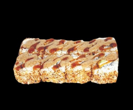 Креветка тигровая, сыр филадельфия, авокадо, хрустящая панировка, соус унаги, соус ореховый, рис, нори