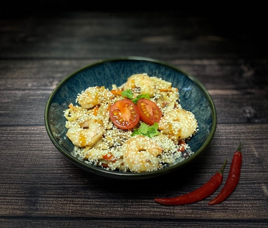 лапша удон, креветки тигровые, грибы шампиньоны, лук, болгарский перец, морковь, соус терияки, кунжут