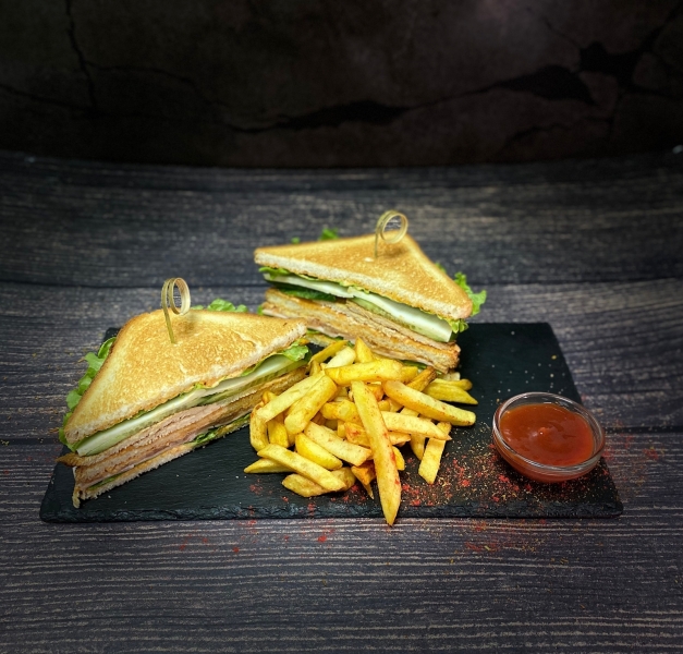Хлеб для сэндвича, ветчина, куриное филе, лист салата, помидор, огурец, сыр моцарелла, соус, картофель Фри, кетчуп
