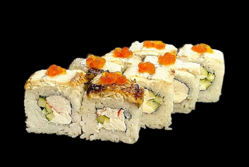 Снежный краб, икра лососевая, угорь, сыр филадельфия, огурец, рис, нори