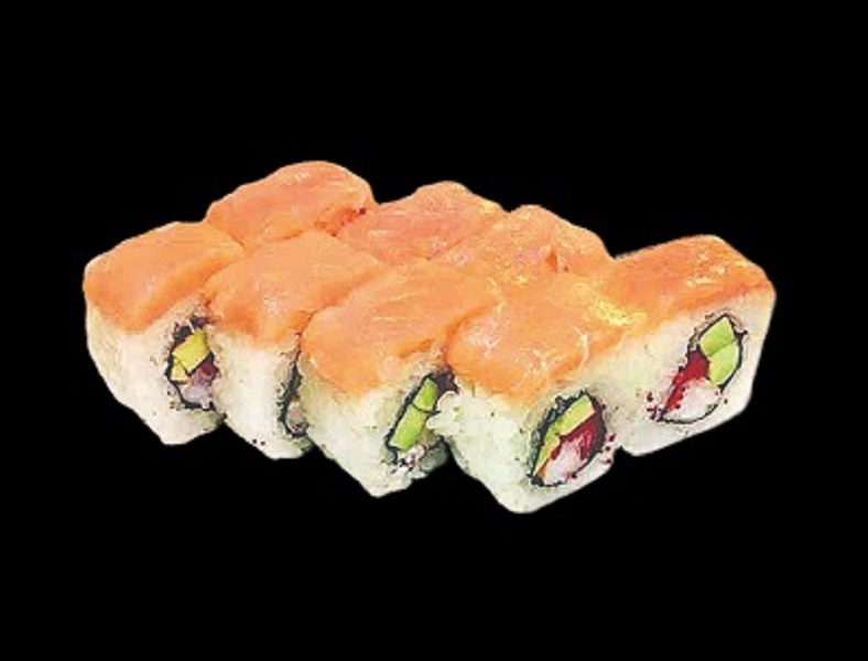 Копченый лосось, креветка тигровая, икра тобико, авокадо, соус спайси, рис, нори