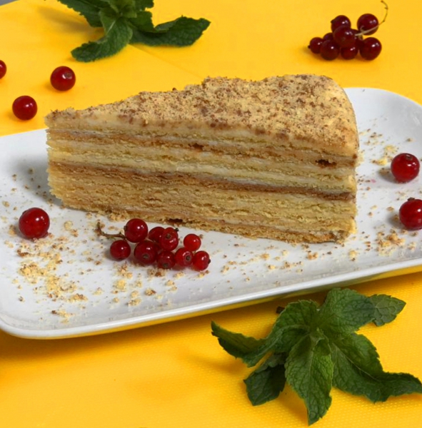 коржи из нежного теста с таежным медом, чередуются со слоями крема из сгущенного молока и сливочного масла