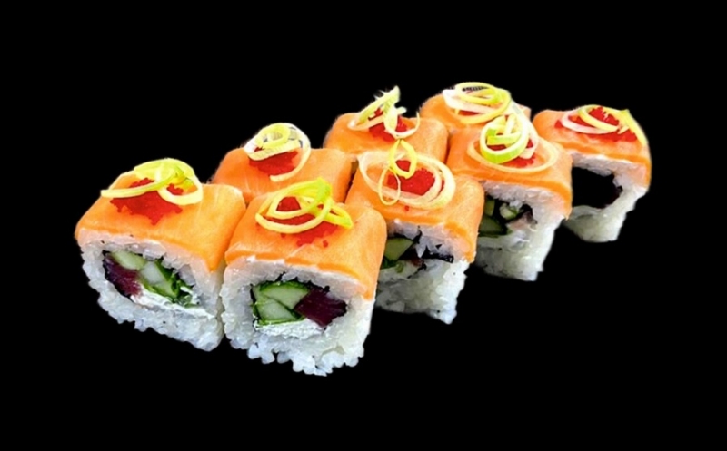 Тунец, сыр филадельфия, икра тобико, лист салата, лосось, огурец, лук порей, рис, нори