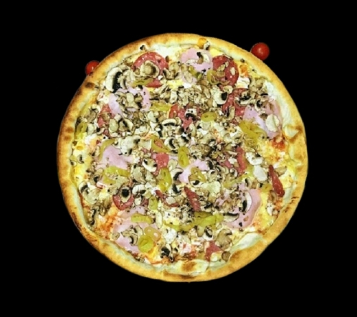 Ветчина, салями, свежие шампиньоны, перчики халапеньо, неаполитанский соус, гауда,