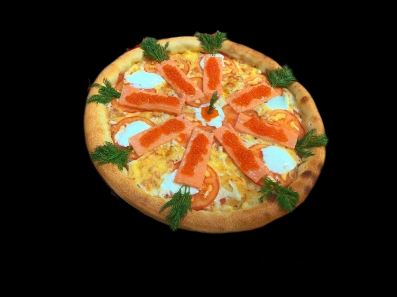 Филе лосося, помидоры, сметана, красная икра, зелень укропа, неаполитанский соус, гауда