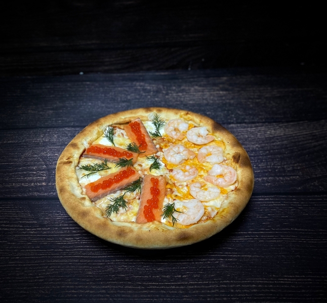 Креветки тигровые, красная икра, сметана, филе лосося, соус спайси, неаполитанский соус, гауда