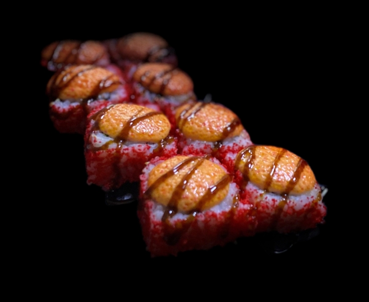 Лосось в соусу терияки, сыр филадельфия, икра тобико, соус спайси, рис, нори