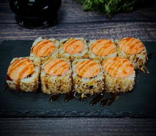Копченый лосось, огурец, лист салата, стружка тунца, соус чиз, соус унаги, рис, нори