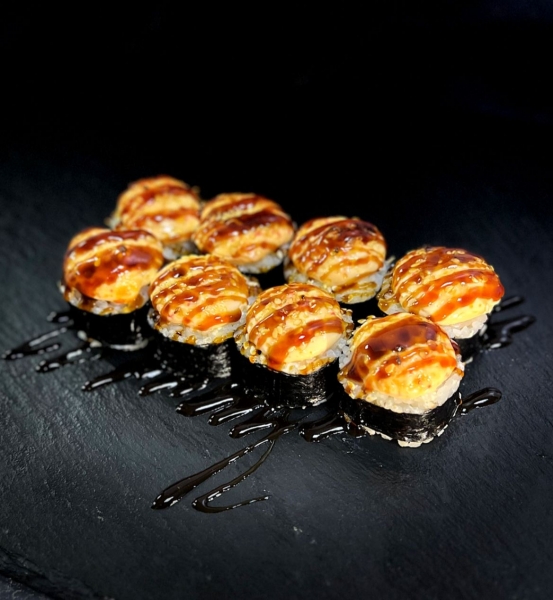 Креветка тигровая, огурец, сыр филадельфия, соус унаги, соус чиз, рис, нори