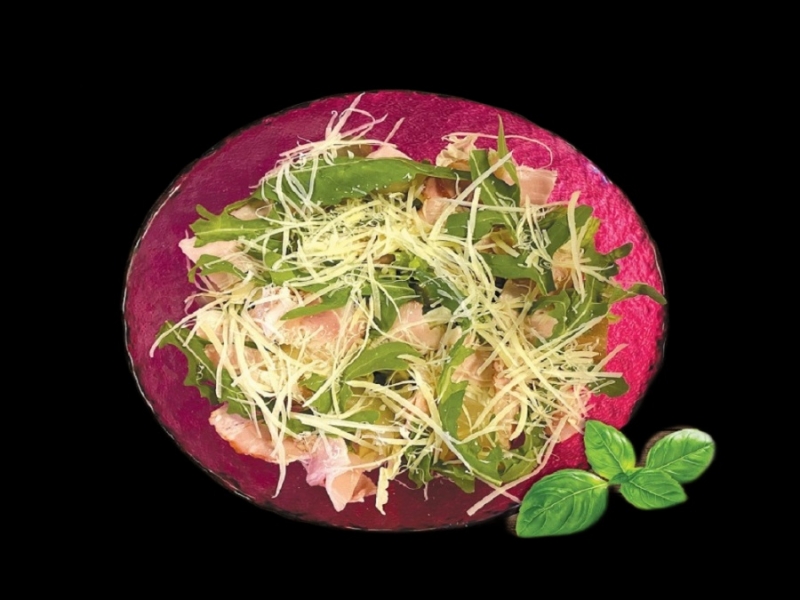 лист салата, пекинская капуста, обжареный бекон, картофель по -деревнски, маринованные огурцы, руккола, горчично-цитрусовый соус