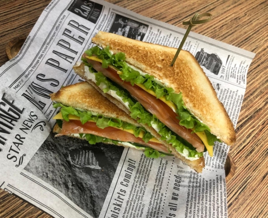 Хлеб для сэндвичей, семга слабосоленая, помидоры, огурцы, лист салата, сыр филадельфия, сыр моцарелла