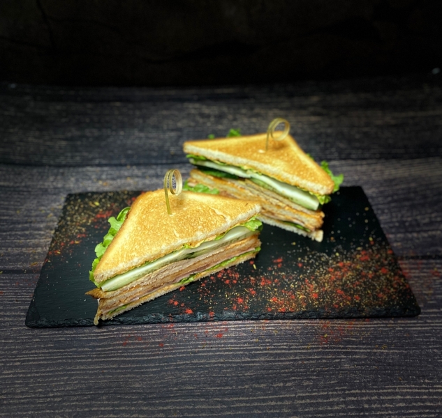 Хлеб для сэндвичей, куриное филе, ветчина, помидоры, огурцы, лист салата, сыр, соус моцарелла