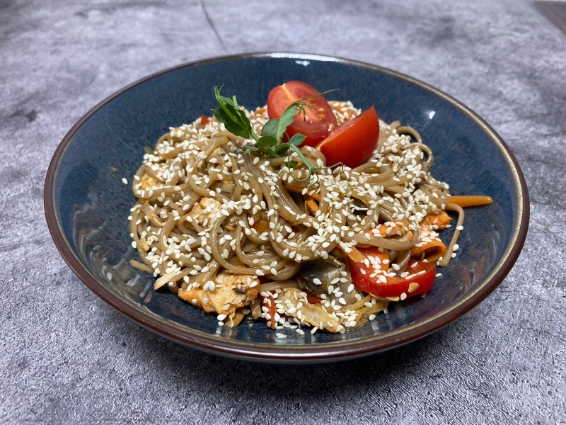 Лапша соба, куриное филе, грибы шампиньоны, лук, болгарский перец, морковь, соус терияки, кунжут
