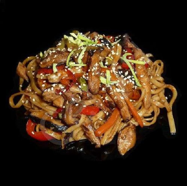 Лапша удон, грибы шампиньоны, лук, болгарский перец, морковь, кунжут, соус терияки