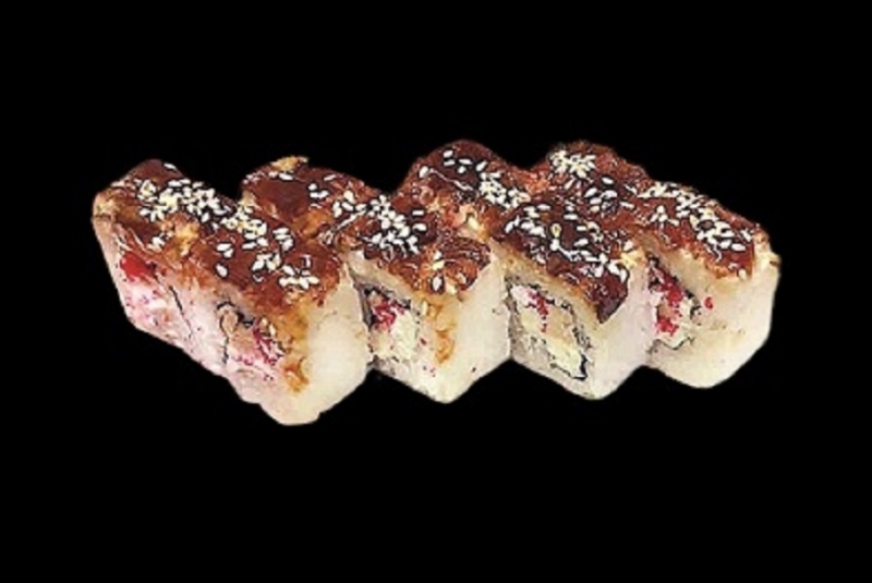 Угорь, икра тобико, сыр филадельфия, соус унаги, кунжут, тамаго, рис, нори