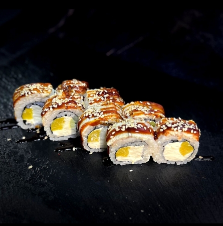 Угорь, сыр филадельфия», такуан, соус унаги, кунжут, рис, нори